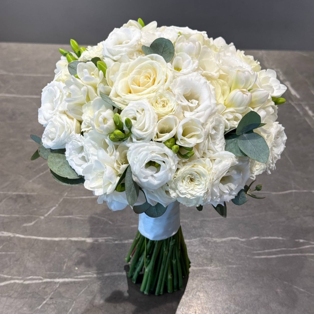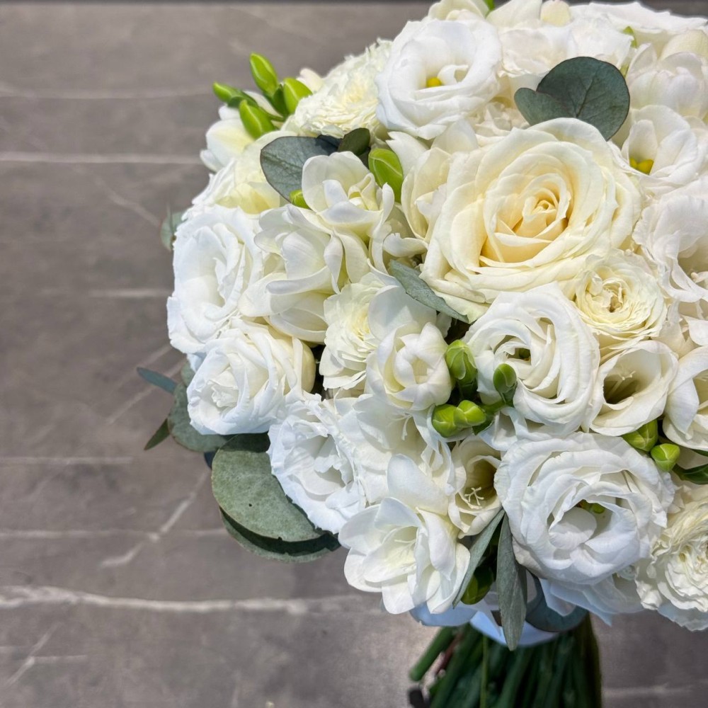 An incredible combination of fragrance, elegance, and refined textures. In this exquisite wedding bouquet, fragrant freesias and delicate eustoma create a light, airy cloud, serving as the perfect backdrop for refined roses.