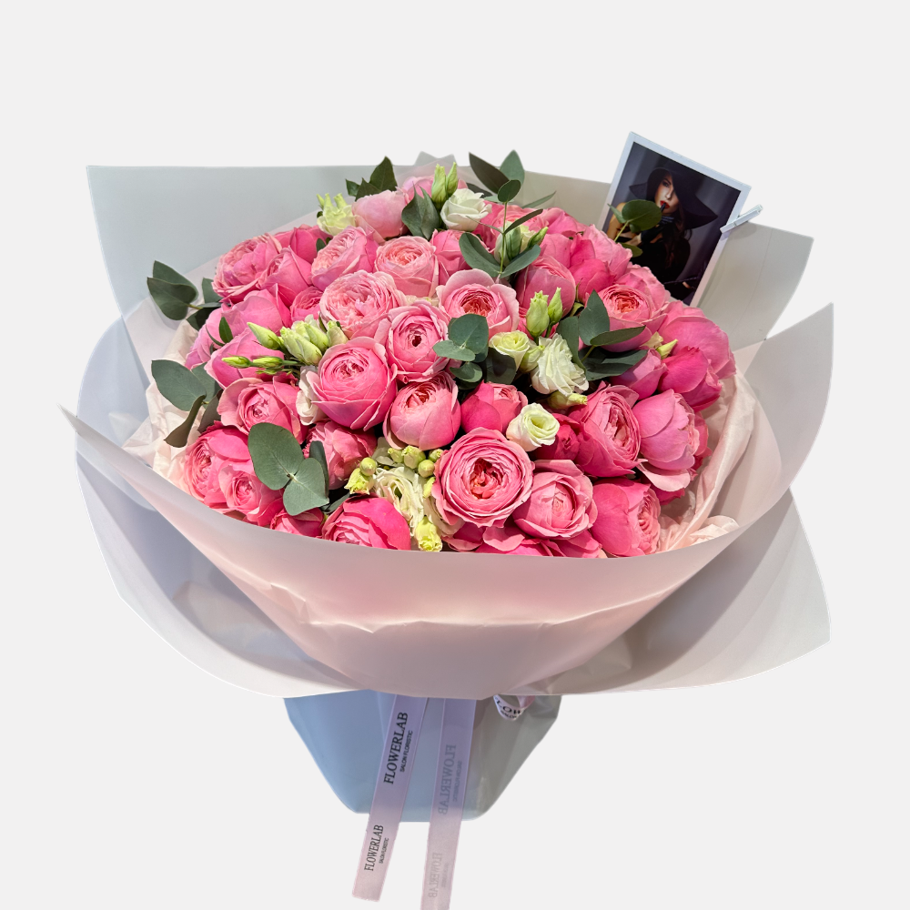 Кустовая пионовидная роза 15штЛизиантусы 2шт Эвкалипт